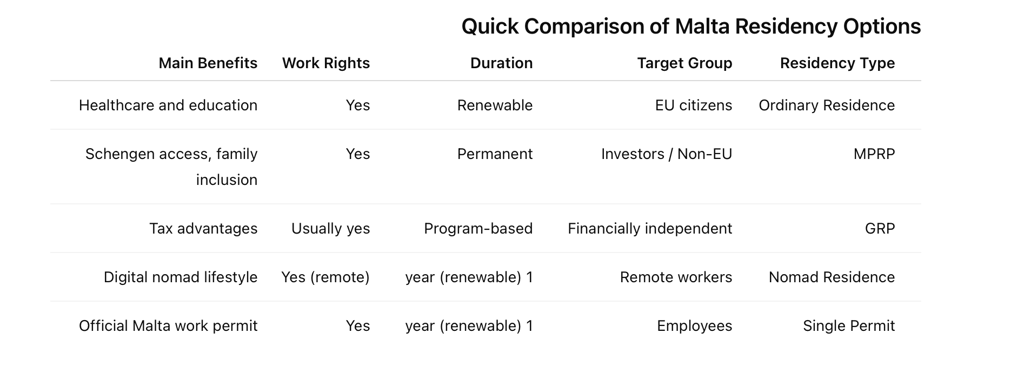 Malta offers a wide range of residency programs and immigration pathways to suit different goals, from investment residency in Malta to remote work visas. Choosing the right Malta residency option depends on your nationality, financial situation, and long-term plans.
